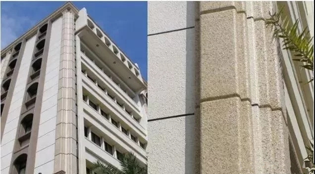 外墻采用石材干掛,將加載上千噸額外負(fù)擔(dān),嚴(yán)重時(shí)將危及生命財(cái)產(chǎn)安全。水包砂用料僅占石材重量的1/30,附著力強(qiáng),不會(huì)像石材那樣整體脫落,有效保障安全。